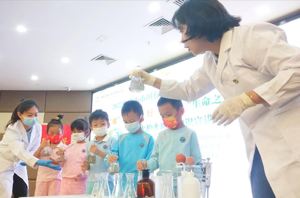 “污水變成清水前需要經過怎樣的處理?為什么臟水不能喝?小朋友知道里面都有哪些壞東西嗎……”在節水護水環保課堂上,為了便于孩子理解接受,宣講人員精選教案,通過卡通動畫視頻方式宣講環保知識,介紹污水處理過程,講解各種藏匿在污水中的有害微生物,并通過現場實驗,直觀展示污水由黑變清的過程,通過實驗互動傳播城市文明理念,增強孩子的節水意識。