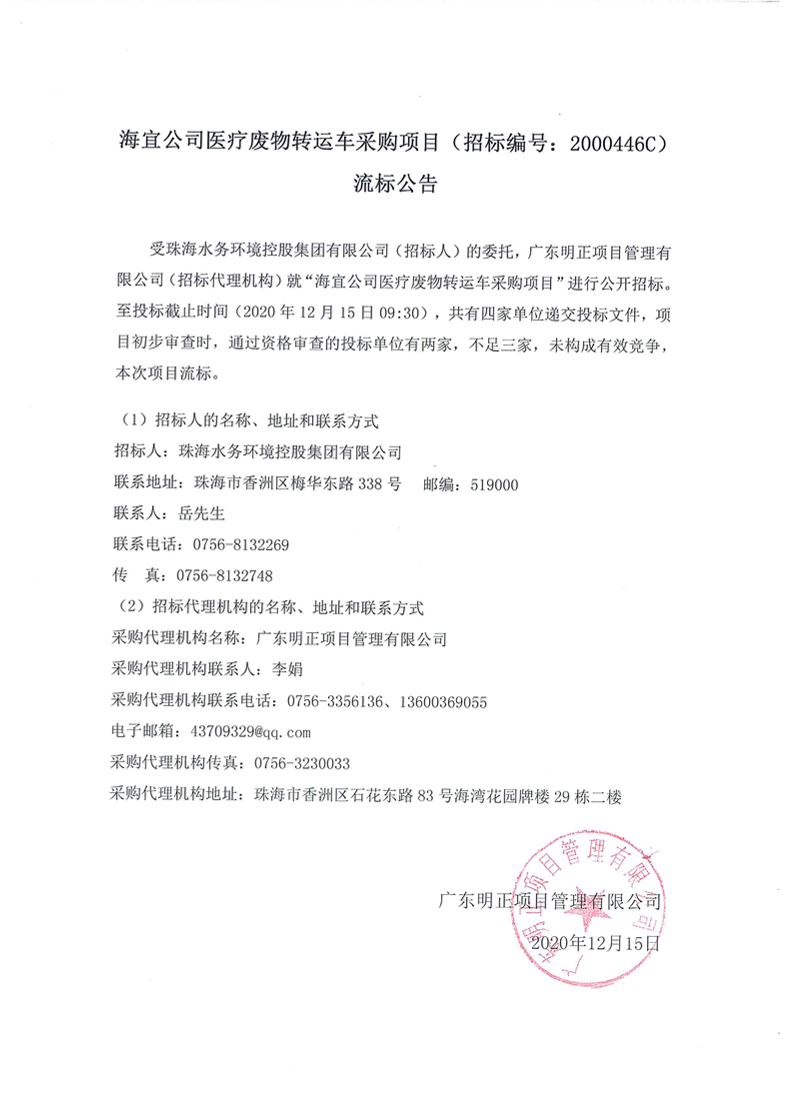 海宜公司醫(yī)療廢物轉(zhuǎn)運車采購項目流標(biāo)公告