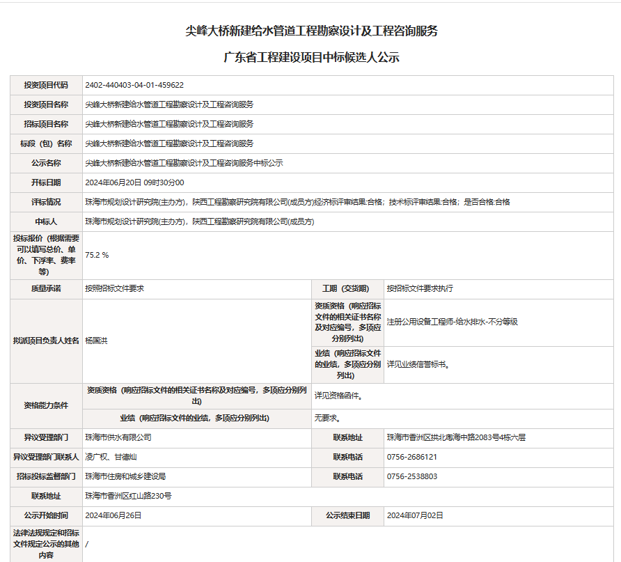 尖峰大橋新建給水管道工程勘察設計及工程咨詢服務中標公示