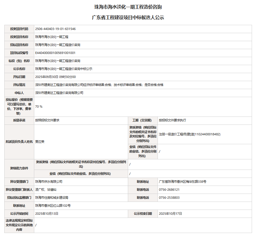 珠海市海水淡化一期工程造價(jià)咨詢中標(biāo)候選人公示